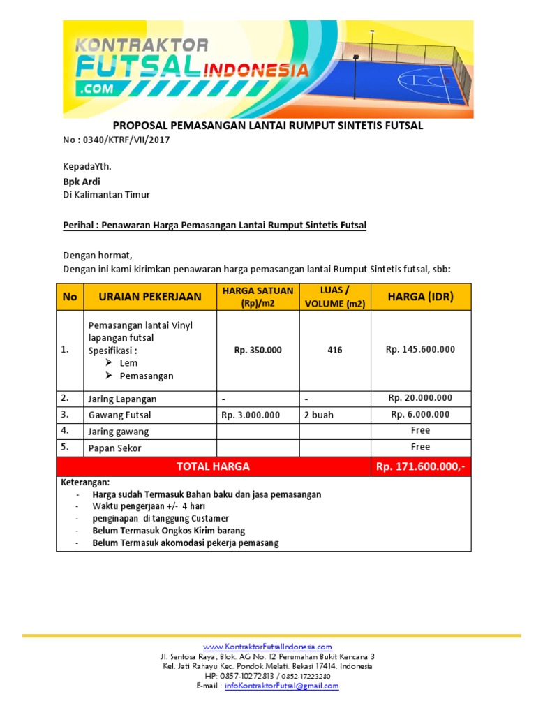 Oleh Kontraktor Futsal Indonesia 10 Jan 2017 Posting Komentar Biaya Pembangunan Lapangan Futsal Indoor Sederhana Terbaru 2020 konsultasikan kepada kontraktor futsal indonesia kami sudah berkompeten dibidang ini. 0328KFIVII2017 Kepada Yth Bpk Bambang Di Tempat Perihal. Jenis lantai rumput sintetis lapangan futsal ini merupakan jenis yang sangat digemari banyak orang.
