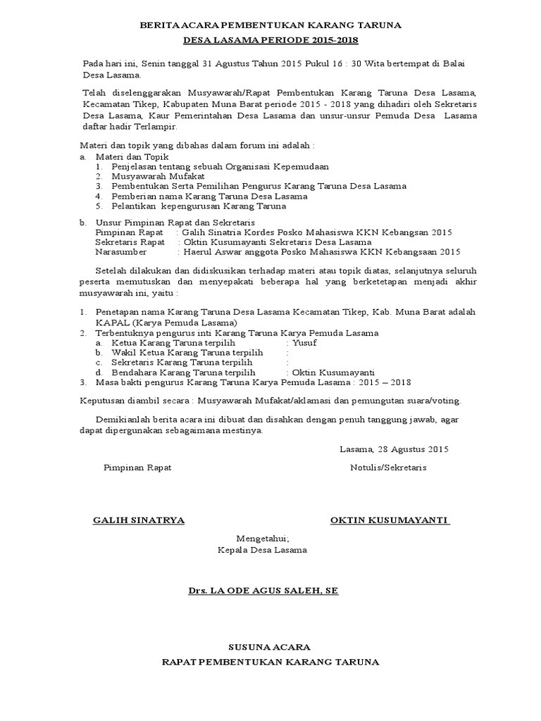 BERITA ACARA PEMBENTUKAN KARANG TARUNA KAMPUNG AMBON KELURAHAN MANOKWARI TIMUR Pada Hari ini Selasa Tanggal Duapuluh Sembilan Bulan Maret Tahun Dua Ribu Enam Belas Pukul Tujuh Belas Lewat Sepuluh Menit Tempat Kediaman Keluarga Sayori. Ad art karang taruna nasional terbaru pdf. Karang Taruna merupakan wadah pengembangan generasi muda nonpartisan yang tumbuh atas dasar kesadaran dan rasa tanggung jawab sosial dari oleh dan untuk masyarakat khususnya generasi muda di wilayah Desa Kelurahan atau komunitas sosial sederajat yang terutama bergerak dibidang kesejahteraan sosial.