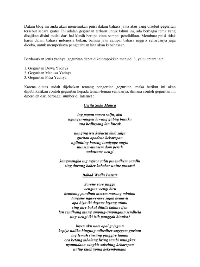 Inilah jenis jenis geguritan bahasa jawa dan ulasan lain mengenai hal-hal yang masih ada kaitannya dengan jenis jenis geguritan bahasa jawa yang Anda cari. Meskipun penggunaan bahasanya bebas tidak mesti menggunakan bahasa jawa krama tapi pemilihan kata yang tepat dan indah harus tetap diperhatikan. Jenis Jenis Geguritan Geguritan Bahasa Jawa dibagi menjadi 3 bagian diantaranya adalah.