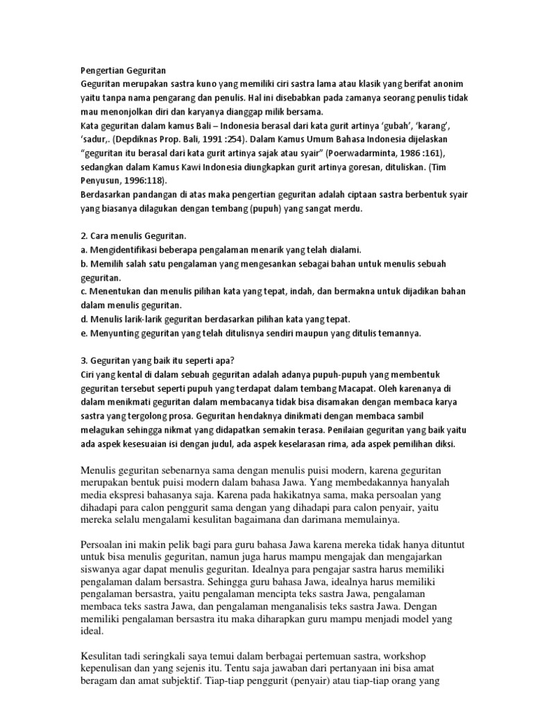 Analisis Gaya Bahasa Pada Geguritan Dalam Majalah. Jenis jenis geguritan Inilah jenis jenis geguritan dan ulasan lain mengenai hal-hal yang masih ada kaitannya dengan jenis jenis geguritan yang Anda cari. Geguritan edisi baru yaitu mempunyai sifat bebas merdeka atau tidak terikat dengan guru gatra guru lagu guru wilangan dan guru swara.