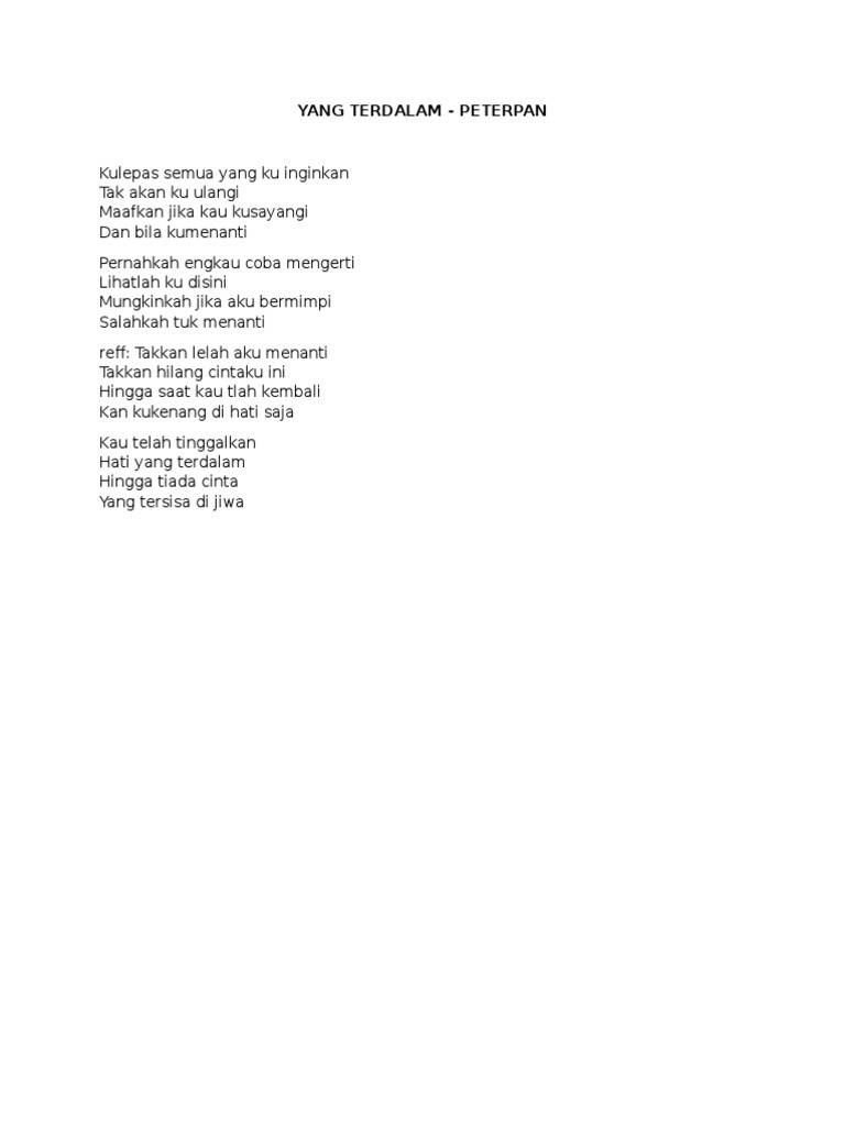 YANG TERDALAM - PETERPAN LIA MAGDALENA COVER LIRIK Lirik. Lirik Yang Terdalam Verse 1 Kulepas semua yang kuinginkan Tak akan kuulangi Maafkan jika kau kusayangi Dan bila ku menanti Pernahkah engkau. About Press Copyright Contact us Creators Advertise Developers Terms Privacy Policy Safety How YouTube works Test new features Press Copyright Contact us Creators.