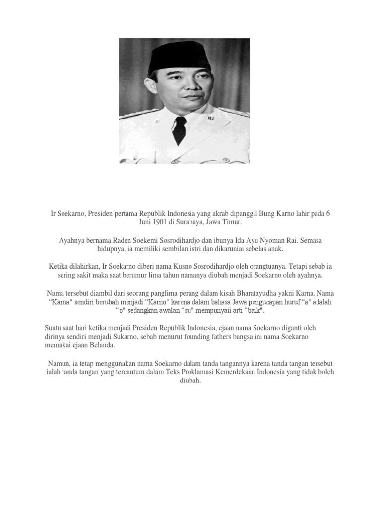 Profil ir soekarno dalam bahasa jawa. 5 735-36 Nama tersebut diambil dari seorang panglima perang dalam kisah Bharata Yudha yaitu Karna. Biografi Dan Profil Susilo Bambang Yudhoyono Presiden Keenam Republik Indonesia Dalam Bahasa Inggris Dan Artinya Precisely on June 21 1970 President Soekarno or Bung Karno breathed his last in Gatot Subroto Hospital Jakarta. Nama Karna menjadi Karno karena dalam bahasa Jawa huruf a berubah menjadi o sedangkan awalan su memiliki arti baik.