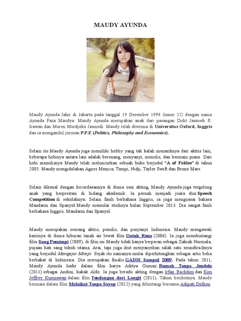 Deskripsi maudy ayunda. Pengalamannya di dunia entertainment ini mengubahnya dari gadis pemalu dan kutu buku menjadi lebih luwes menampilkan diri di. Hingga saat ini sudah ada beberapa karya yang berhasil ia telurkan. Buku ini ditulis dalam Bahasa Inggris dan disampaikan dengan kata-kata.