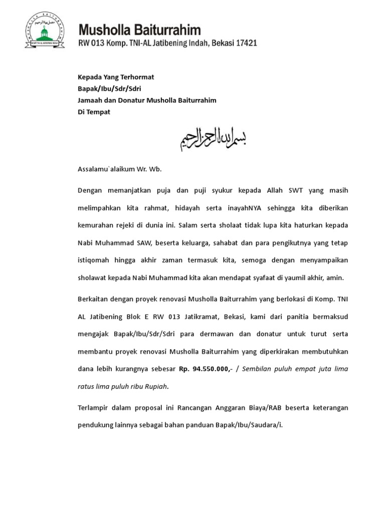 Proposal permohonan bantuan dana pembangunan Musholla Al-Amin pada desa Kedung Malang Kecamatan Kedung Kabupaten Jepara telah disusun berdasarkan kondisi dan kebutuhan yang riil. Academia edu is a platform for academics to share research papers. Mushola proposal pembangunan mushola sekolah proposal pembangunan musholla doc proposal pembangunan musholla 2018 rab pembangunan mushola proposal pembangunan mushola sekolah doc proposal pembangunan mushola pdf Cara membuat Proposal bantuan dana pembangunan WC dan Kamar Mandi PONDOK PESANTREN bagian 2.